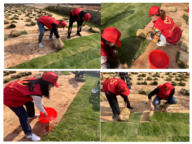 (志愿者們動手鋪設(shè)草皮、讓原本裸露的土地變成了綠油油的草坪)